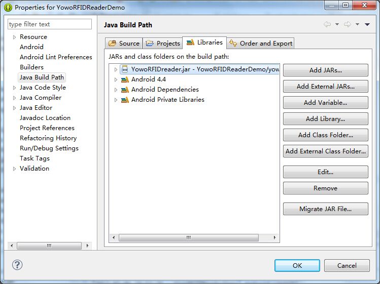 在ADT工程中導(dǎo)入yoworfidreader.jar庫文件,即可在工程中引用NFC讀寫器的類文件