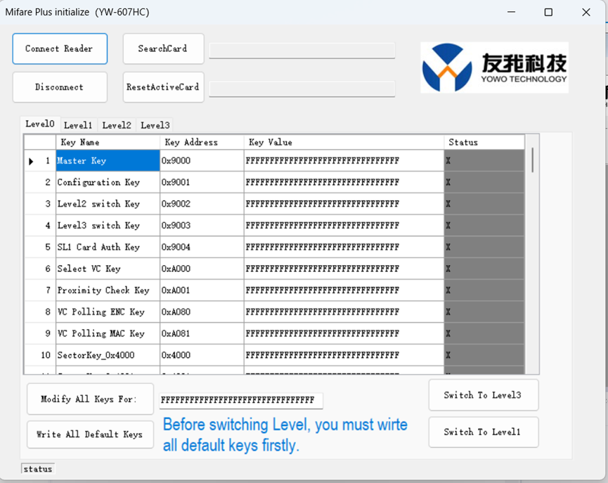 Switch TO Level1: 將卡片切換到LEVEL1, 在執(zhí)行該功能前,需先寫入默認密鑰