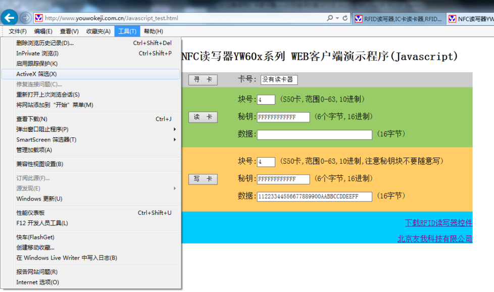 ? ? 在瀏覽器調(diào)用友我科技IC卡讀卡器ocx可能出現(xiàn)各種錯誤或者提示,一般這種提示或者錯誤都是設(shè)置項不合適造成的,通過調(diào)整設(shè)置項一般都能解決。本文將針對IE瀏覽器的各種提示和錯誤提出各種應對的解決方法。