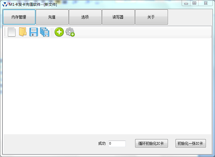 主界面功能主要分為IC卡內(nèi)存管理,充值,選項(xiàng),讀寫器,關(guān)于 共5個(gè)部分。